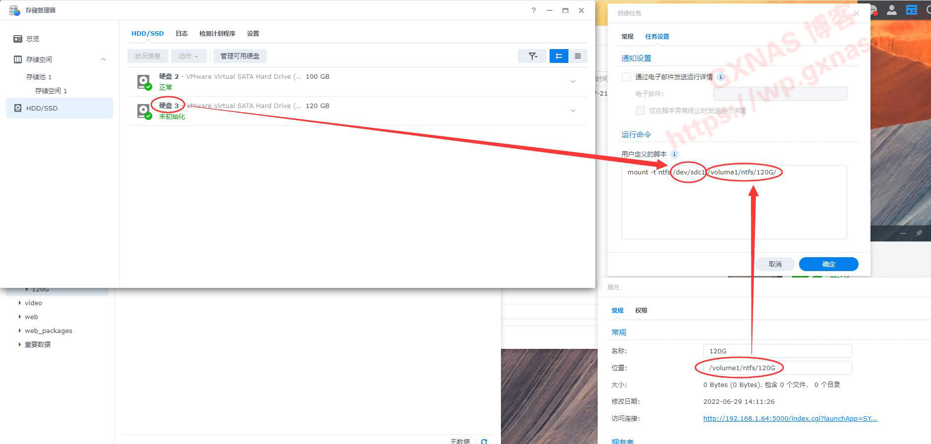 (2)脚本中的“/volume1/ntfs/120G/”为第10步骤复制出来的路径,具体以你实际路径为准,不要照抄我的;