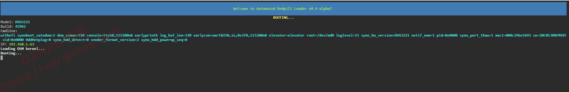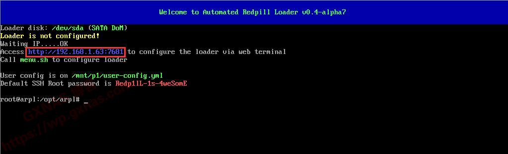 1、本教程采用arpl项目进行编译(如果你不懂arpl是什么,请先移步去学习《史上最简单的黑群晖DSM7.X引导编译方法》,学会了再来看这篇教程):先把机器配置好以后,开机启动直到有IP地址显示出来,在电脑浏览器打开这个IP地址;