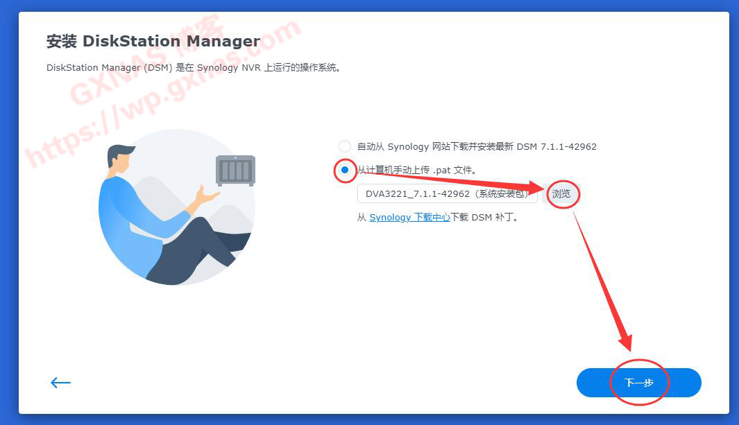 16、选择“从计算机手动上传 .PAT文件”,上传好事先下载的DVA3221_7.1.1-42962的PAT文件,下一步;