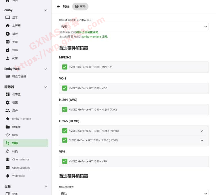 33、网友使用GT1030独显安装DVA3221群晖系统,在EMBY里面开启硬解的设置。)