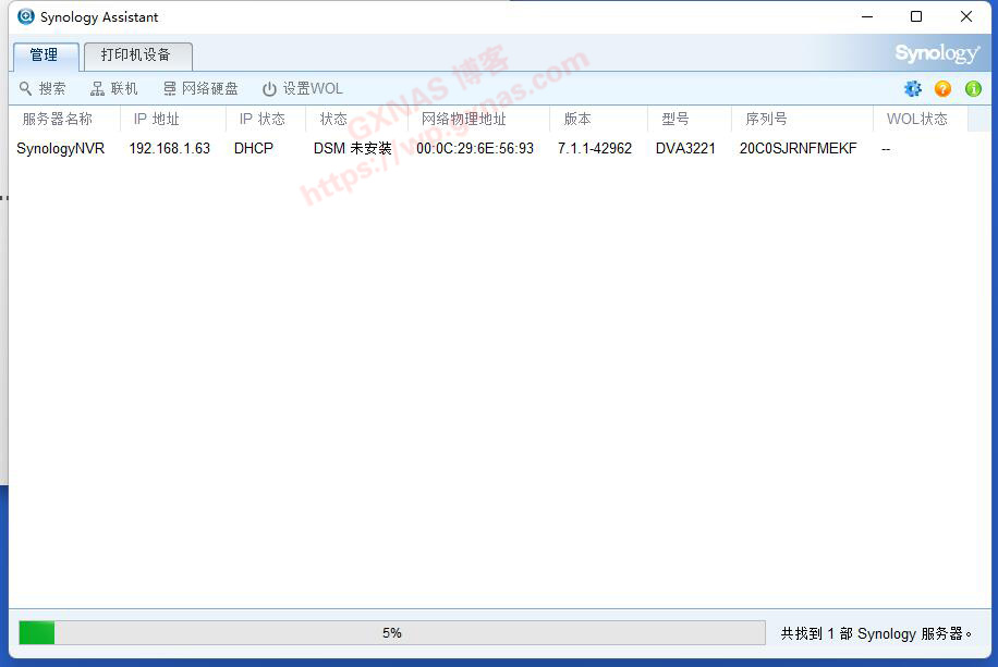 13、在电脑上用群晖助手搜索,可以看到有一台NAS的状态显示为“未安装”,就是这台了(如果搜索不出来有可能是你的电脑防火墙拦截了,请关掉防火墙,实在不行的话去路由器找IP),在显示的IP地址点鼠标右键,安装;