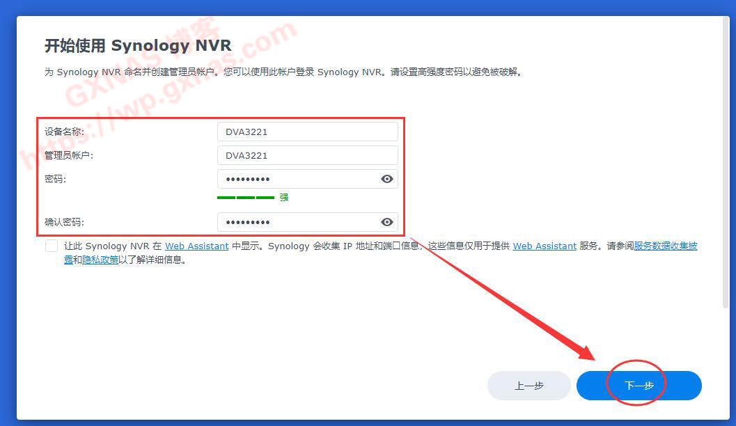 19、设置好设备名称、管理员账号名、管理员登录密码,下一步;