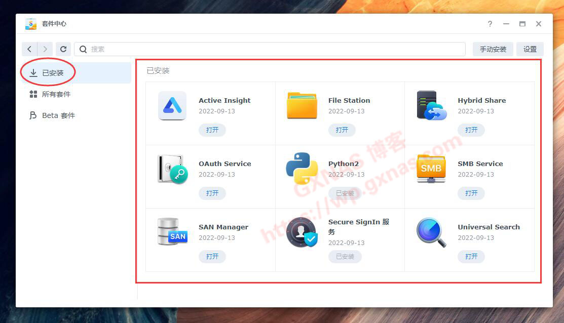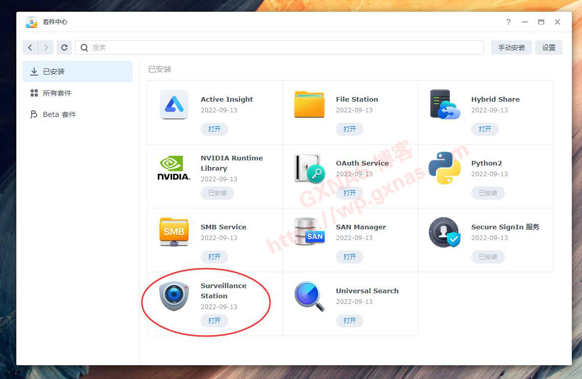 27、点左边“已安装”,能看到系统默认安装的所有套件列表,此时发现Surveillance Station并没有安装好,但是你不要自作聪明的去手动安装套件哦,否则就没有8个免费的授权了(有网友反馈说自己安装也可以有8个授权,但是我第一次装系统的时候不知道就自己安装了套件,结果发现只有2个授权。);