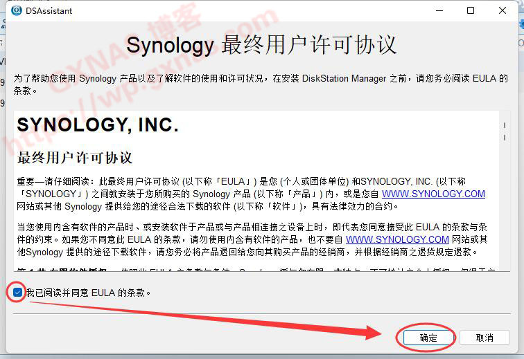 14、在弹出的界面左下角“我已阅读并同意 EULA 条款”处打勾,再点“确定”;