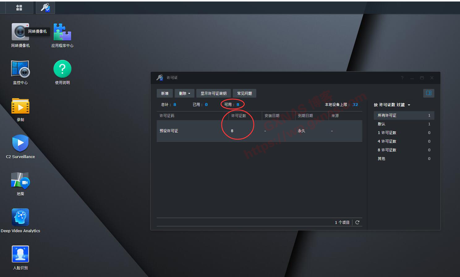 30、进入到Surveillance Station的界面,通过左上角菜单,找到许可证,可以看到预设的许可证数量为8,可以接入8路摄像头;)
