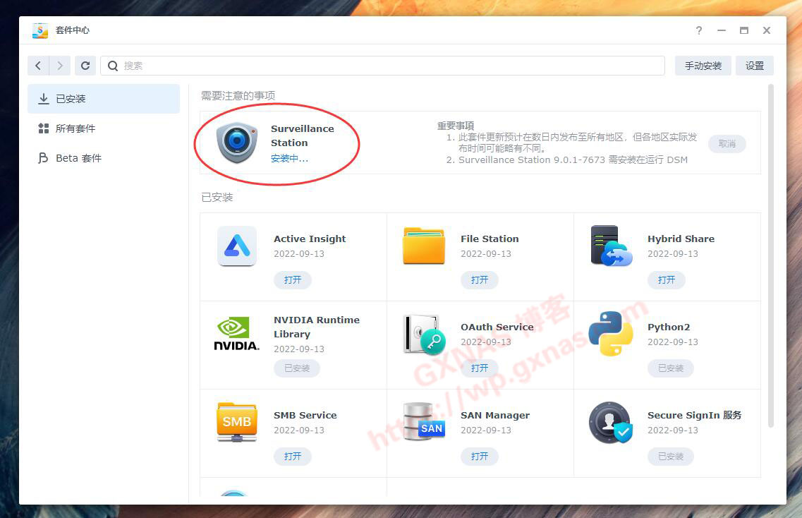 24、重点来了:有一行小字提示“正在安装Surveillance Station”;