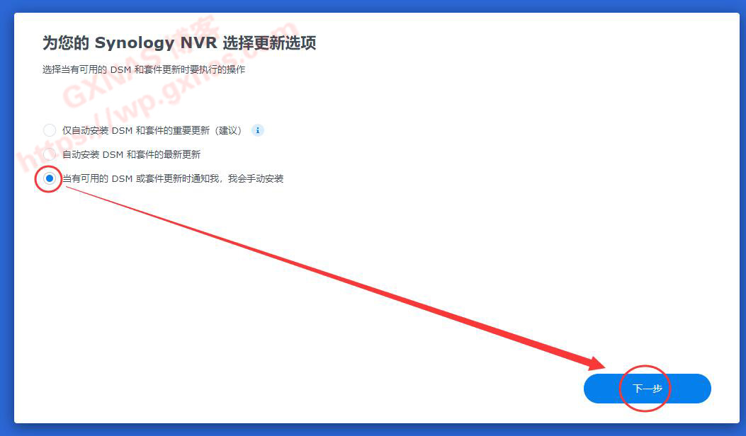 20、选择“当有可用的DSM或者套件更新时通知我,我会手动安装”,下一步;