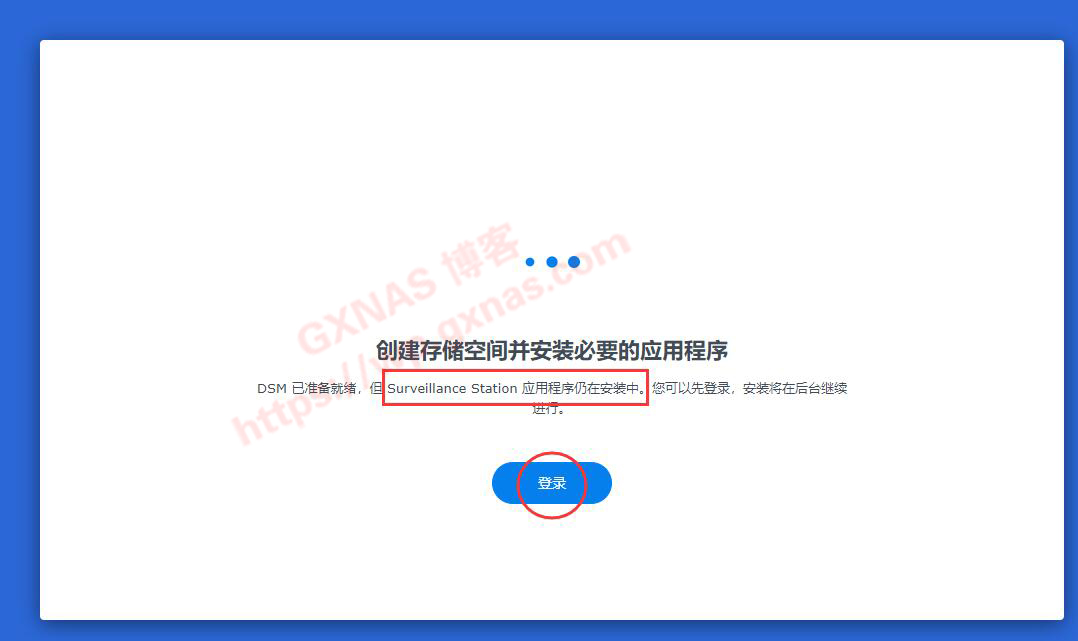 25、这里会提示“DSM已准备就绪,但Surveillance Station应用程序仍在安装中”,要注意看哦,点“登录”;