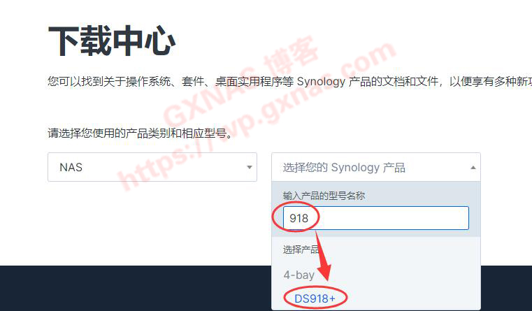 5、比如我想要下载DS918+的6.23-25426版本的安装包,那么只需要输入“918”这个关键字,就看到列表中有显示“DS918+”这个产品的全称,点选“DS918+”;