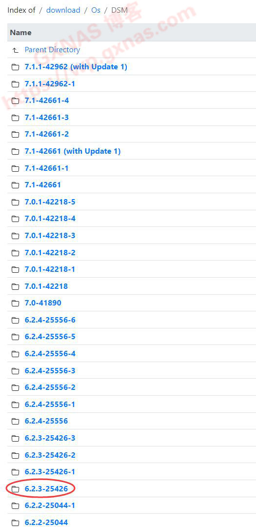 7、浏览器会新弹出一个界面,罗列出当前所有群晖系统版本,找到我想要下载的6.23-25426版本的这个文件夹,点进去;