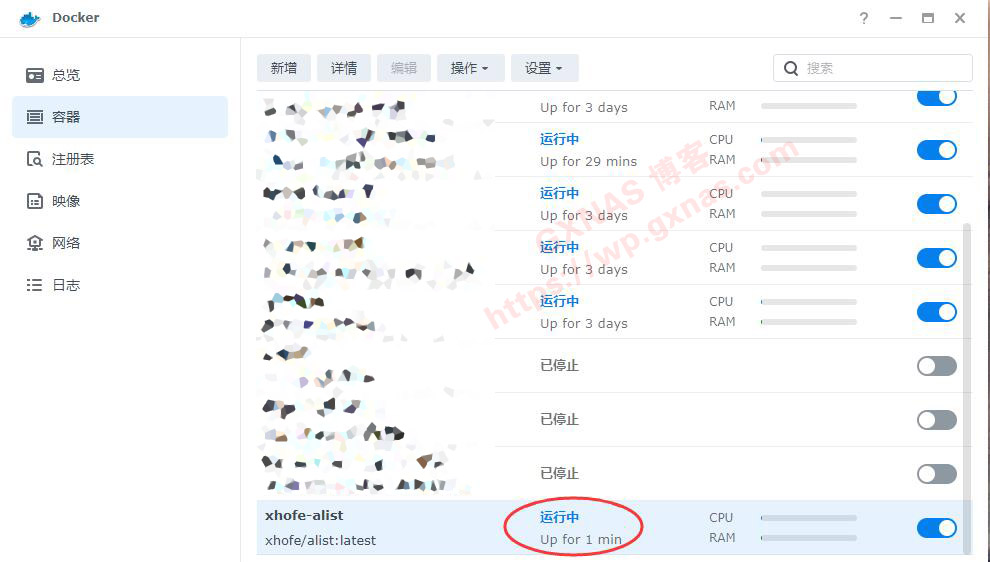 1、打开群晖Docker,左边菜单“容器”,找到你想要设置定时重启/关闭/开启的容器,记录一下名称(以我的群晖为例,容器名称为xhofe-alist,该容器已经运行了3天);