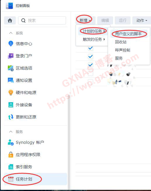 3、打开群晖控制面板,在任务计划,新增,计划的任务,用户定义的脚本;