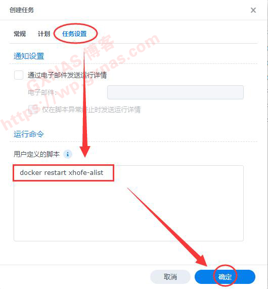 6、在任务设置的用户定义的脚本输入以下命令(xhofe-alist为上面第1个步骤的容器名称,请自行修改为你实际的容器名称),确定: