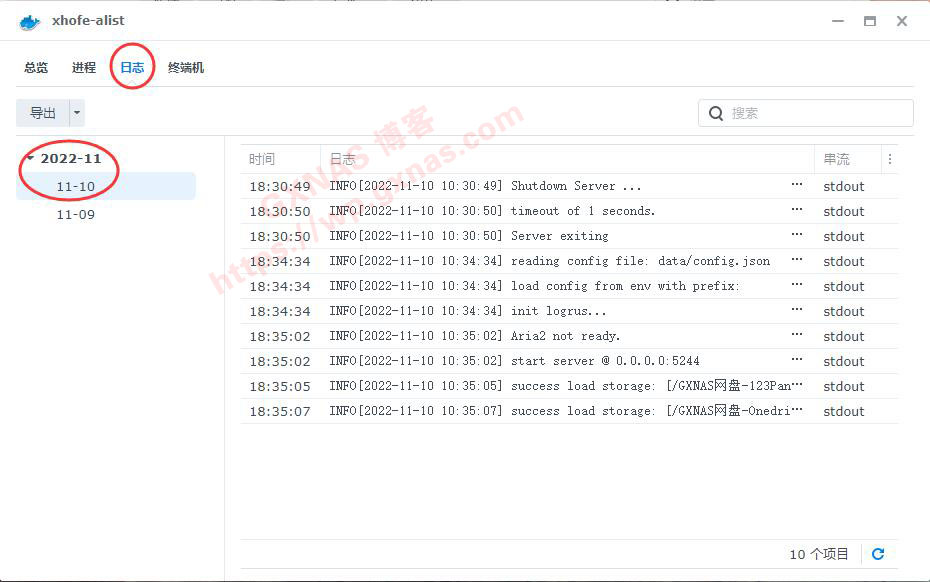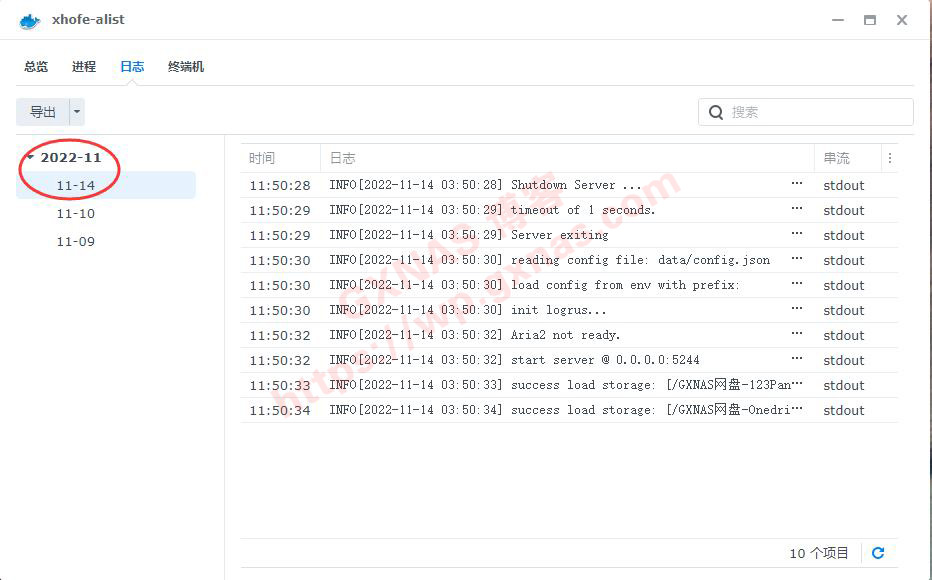 2、点一下容器的日志,看到最后生成日志的时间是2022年11月10日,的确不是今天的;