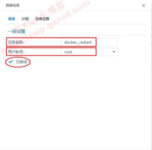 4、一般设置里面,填写任务名称,用户账号要设置为root,在“已启动”处打勾;