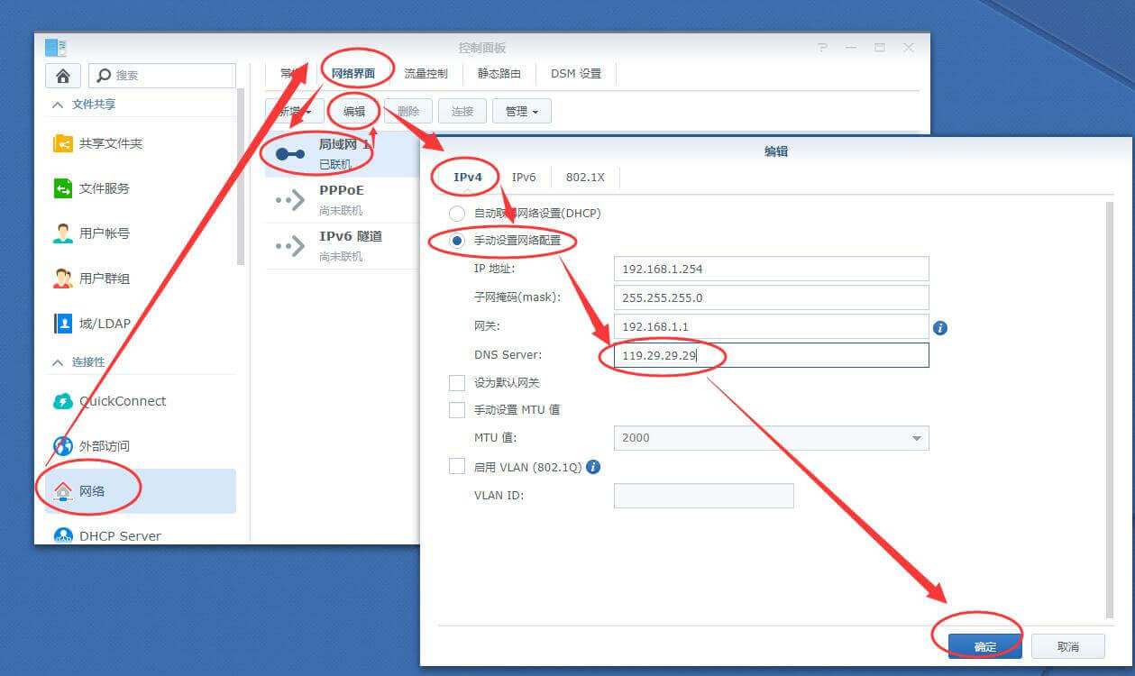 打开群晖控制面板,网络,网络界面,局域网1,编辑,IPv4,设置为手动设置网络配置,根据你的实际情况填上群晖的内网IP地址,子网掩码,网关,然后DNS Server填写上面你想使用的公共DNS服务器IP地址,本文用的是119.29.29.29,点确定即可生效。