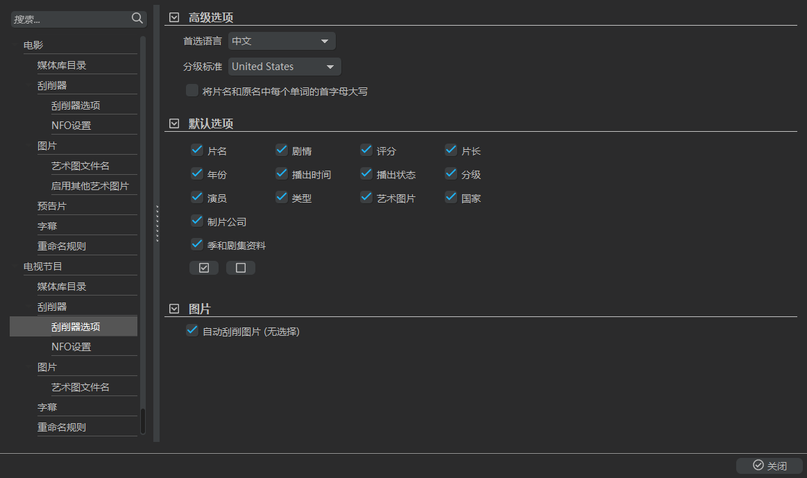 这里我们选择TMM自带的刮削器,可以自定义每一个选项的元数据来源网站。其他的不需要选,我也不想解释了,里面都有中文介绍。