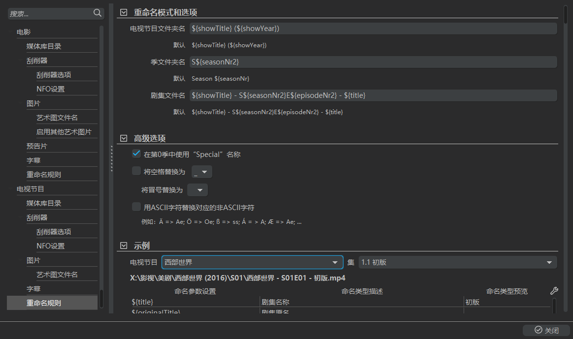 剧集文件名:${showTitle} – S${seasonNr2}E${episodeNr2} – ${title}:我们把这个规则组合拆开说一下, ${showTitle} =电视节目名, S${seasonNr2}E${episodeNr2} 季名+剧集名称, Nr2只全部两位数的数字结构, ${title} =集的名称