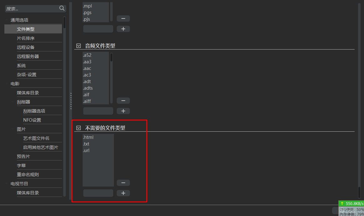不需要的文件类型:在这里添加不想要的文件类型格式,比如.TXT,.URL等扩展名格式,主要的用途就是,当你用BT等下载一部电影,里面会有个别网站宣传文本,网址链接地址等,在这里面添加不需要的文件,可以后期使用TMM统一删除这些不需要的文件。