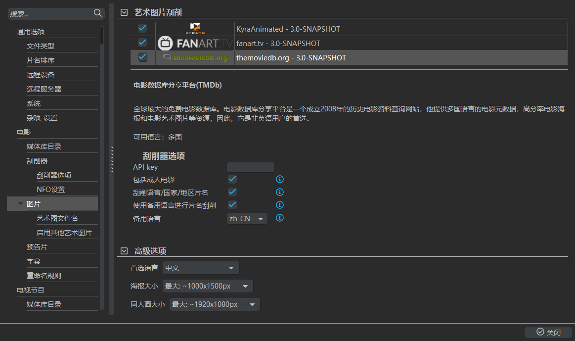 可以从TheMovieDB.org和Fanart.tv下载诸如,同人画,封面海报,艺术图片,光盘封面,logos等艺术图片。