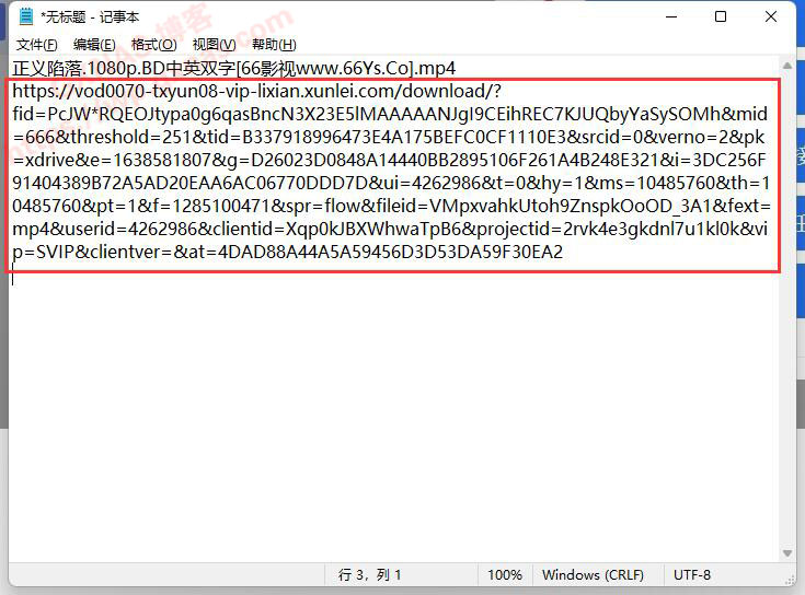 5、打开一个记事本,粘贴,第一行是文件名,不要,选中后面全部的内容,复制一下,这个就是迅雷链接;