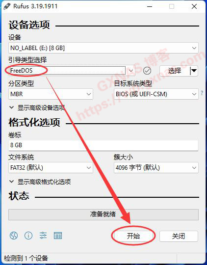 4、确认一下“设备”显示的是你的U盘,选择“FreeDOS”,然后点“开始”;)