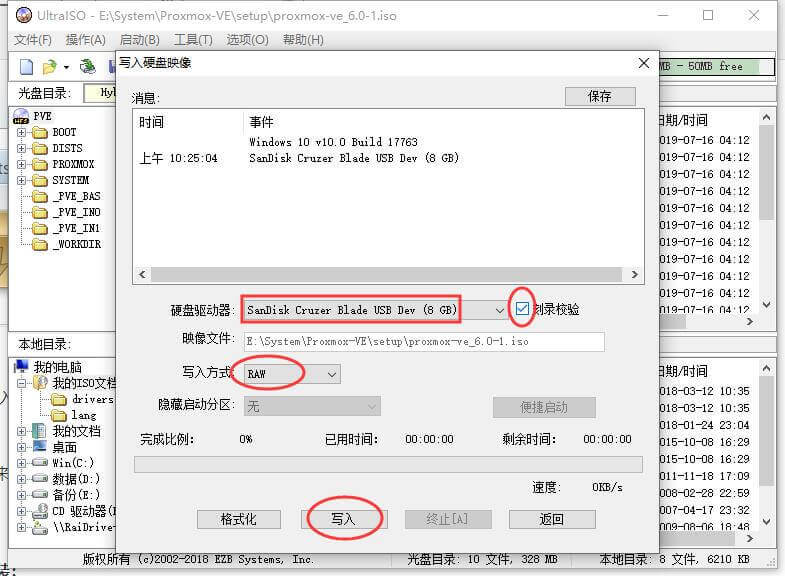 2、下载PVE镜像文件后用ultraiso打开,菜单-启动-写入硬盘映像,写入U盘,需要注意的是: