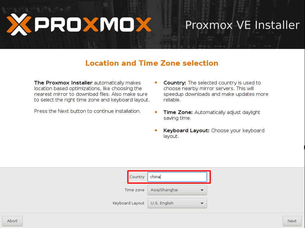 其它默认,只要将国家选择成China,如果没有可以手动填写,填完就下一步: