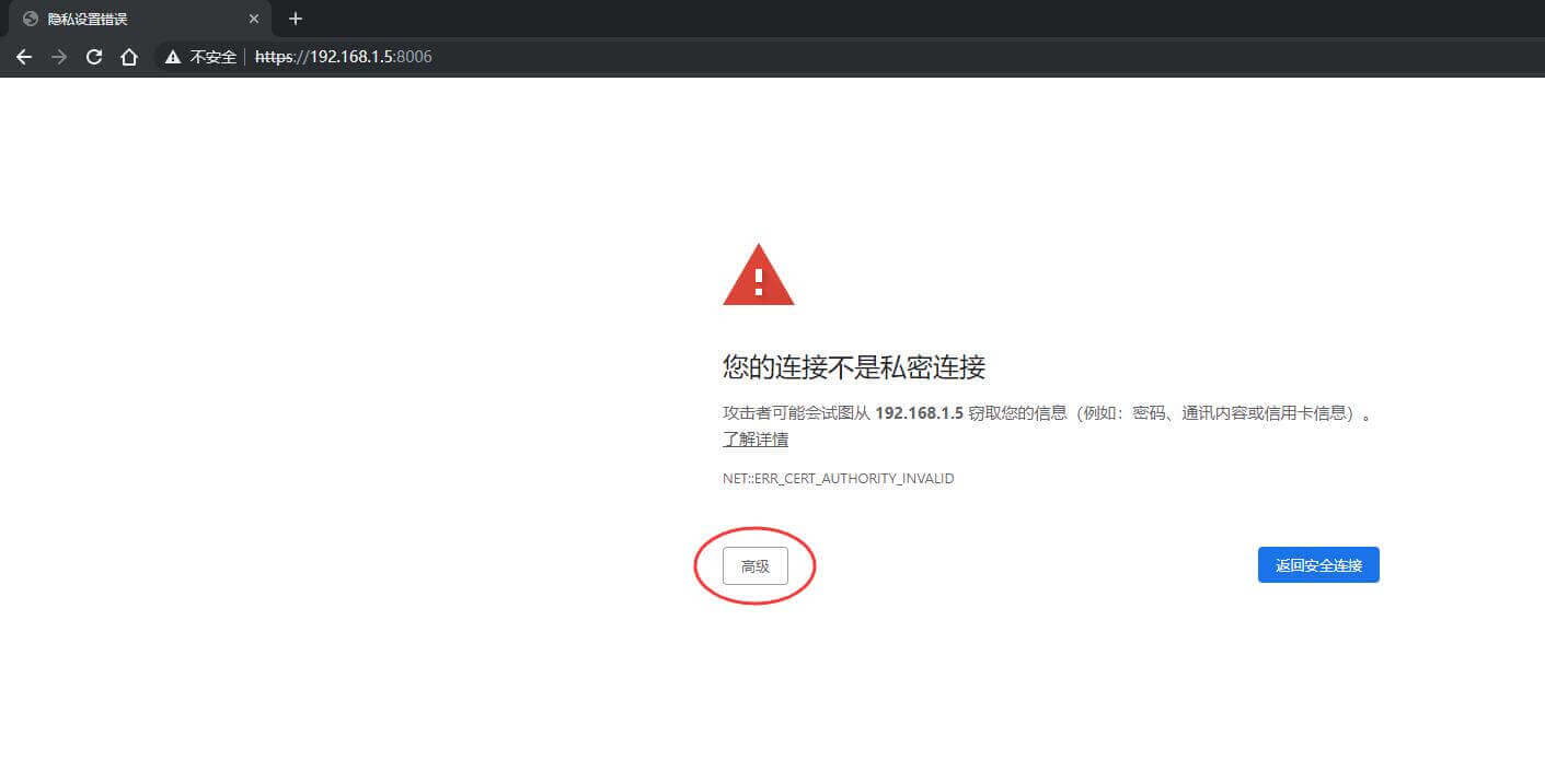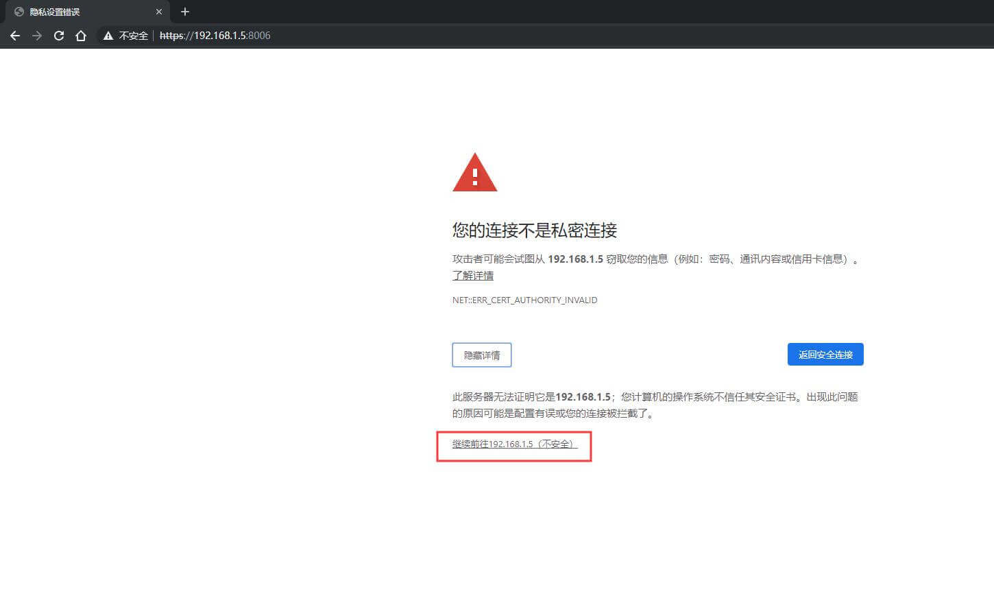 有些浏览器可能会弹出隐私错误的提示,这是由于PVE使用https访问但是又没有使用SSL证书,并不是真正的不安全,请放心使用!选 高级
