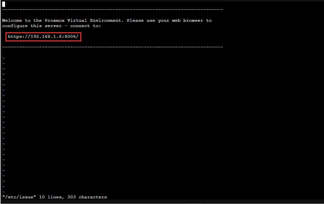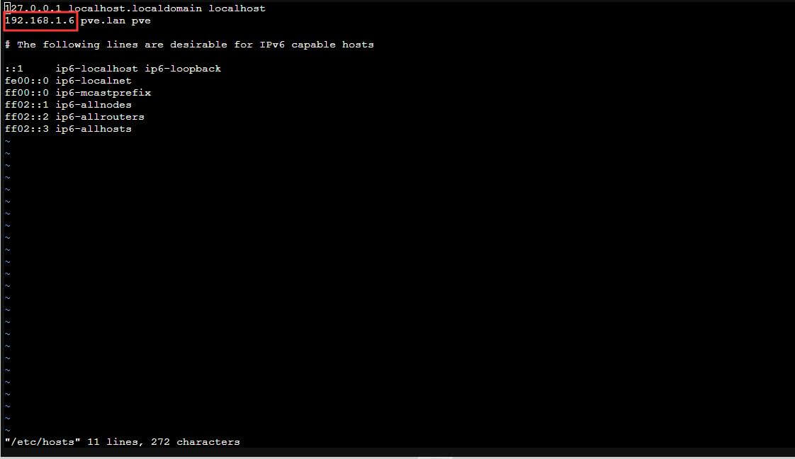 通过键盘上下左右移动到https://这行的IP地址,按一次i进入修改状态,修改为新的IP地址,端口8006不要改,修改完成确认无误后按一次ESC键输入:wq!回车保存退出。