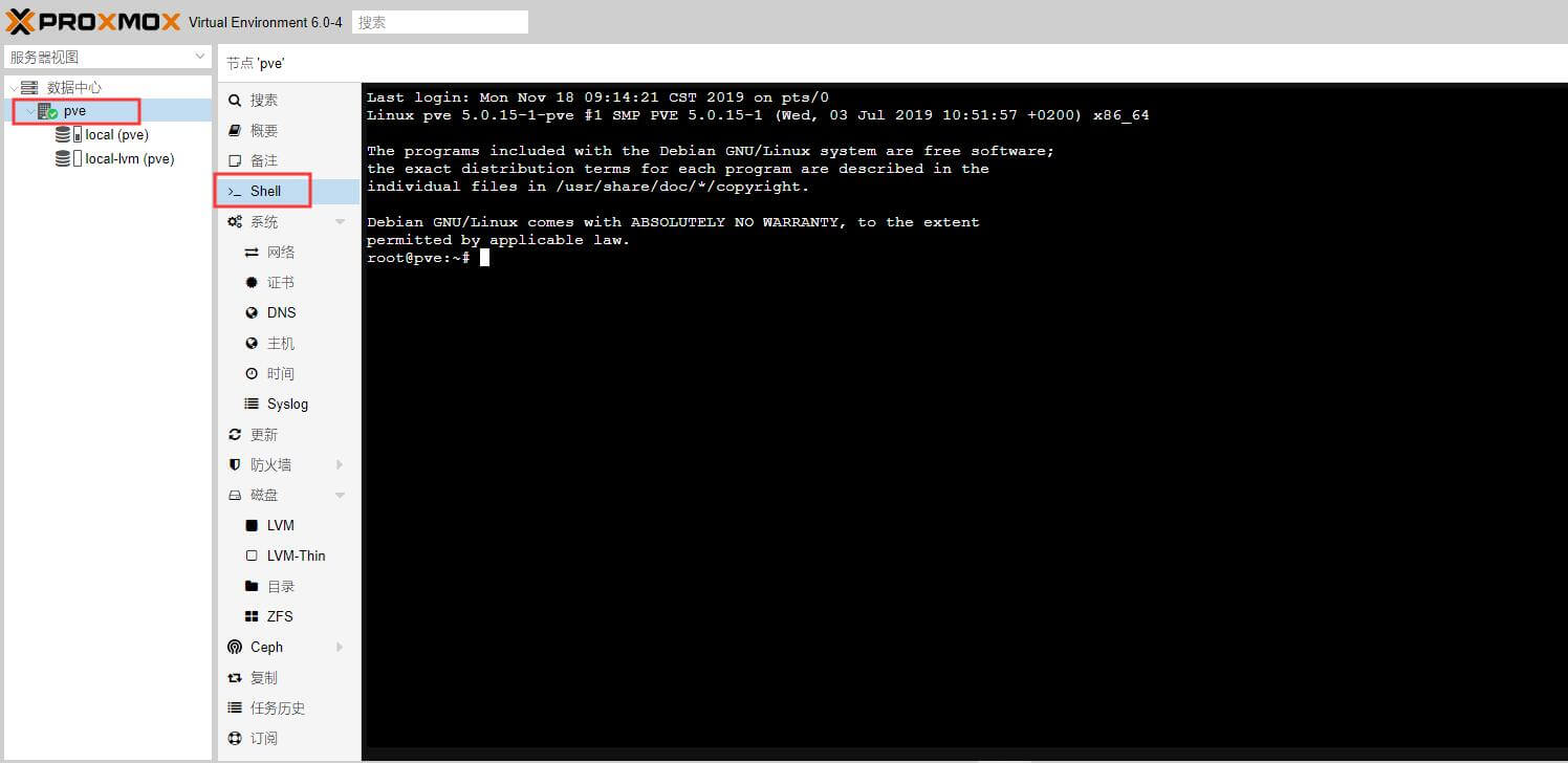 一、在局域网的电脑浏览器输入PVE的IP地址登录后台,从左边的菜单找到“PVE”—“_Shell”菜单,进入网页版的ssh界面下;或者在主机的控制台下输入root密码后登录到ssh下;