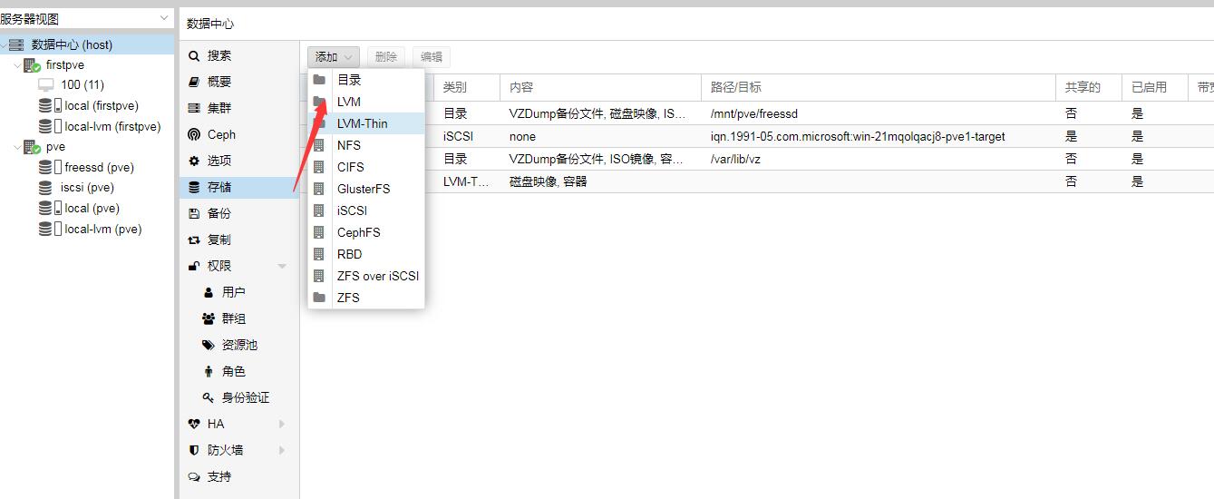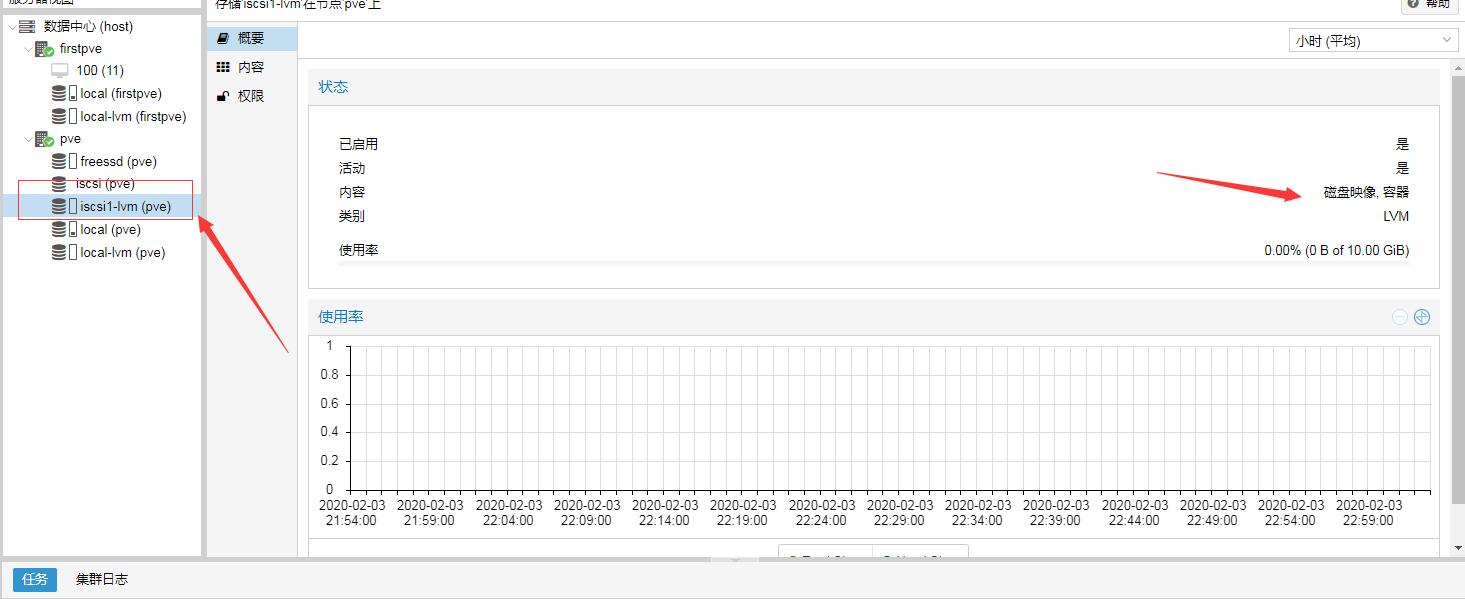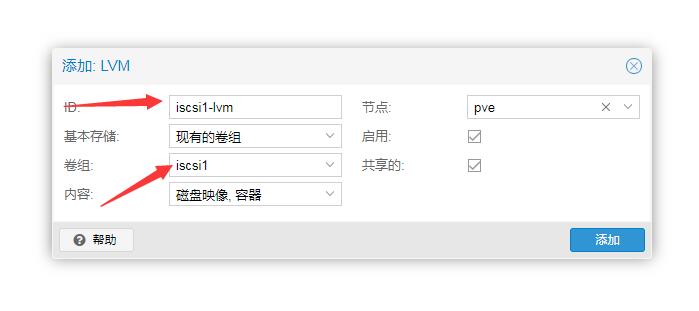 这里ID,自己填,方便记忆,卷组填 选择刚才创建的pv iscsi1。勾选共享的,然后添加。在pve节点中,就可以看到这个lvm了,内容也有了