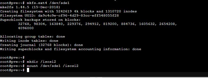 mkfs.ext4 /dev/sde1 mkdir /iscsi2 //创建iscsi2目录,用来挂载分区mount /dev/sde1 /iscsi2 //挂载/dev/sde1 到iscsi2