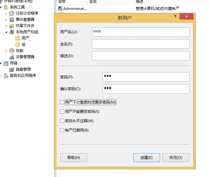 在计算机管理里面,找到本地用户和组,新建一个smb账号