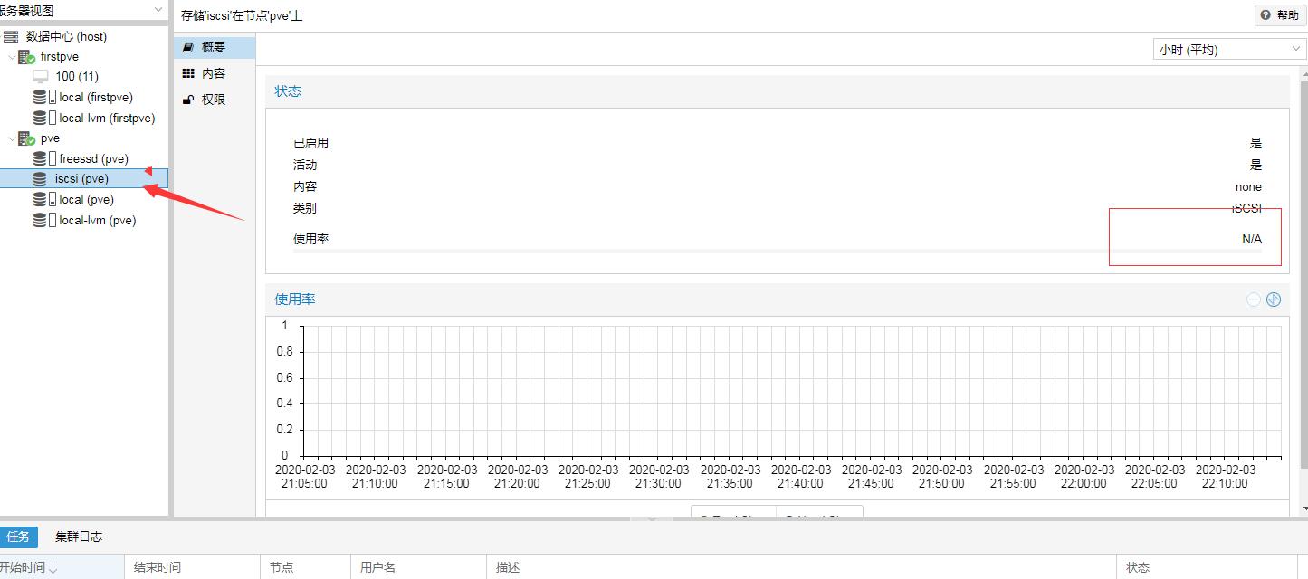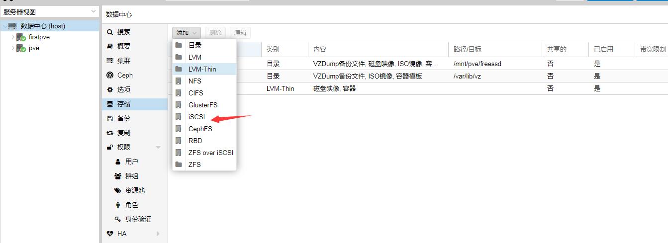 填好之后,点击添加,即可看到储存里有个iscsi了,但是不能用