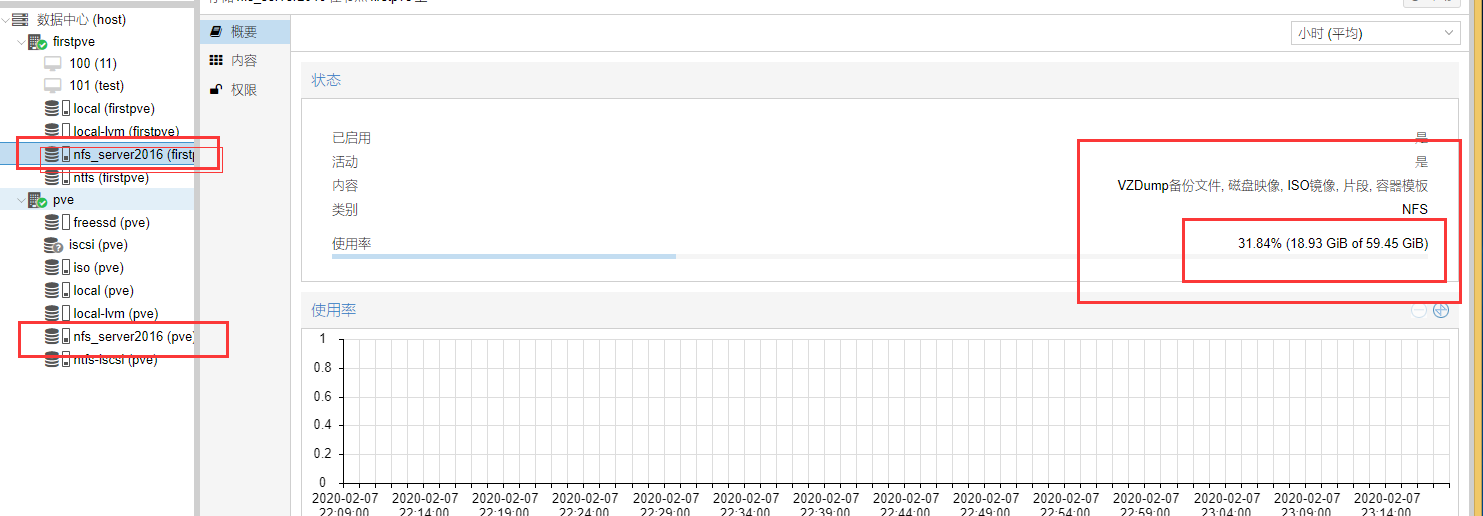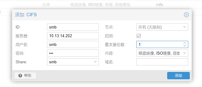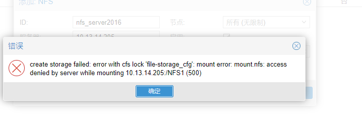 需要注意的是,在集群环境中,需要nfs做客户端映射的,就需要在节点选择nfs映射的节点。我这里是未映射就能访问,所以我这集群中,2个pve都能挂载,我就没选了。