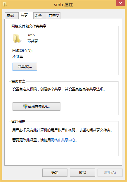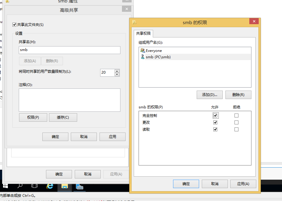 勾选共享此文件夹,点击权限,添加刚才创建的smb用户,并把权限设置成完全控制
