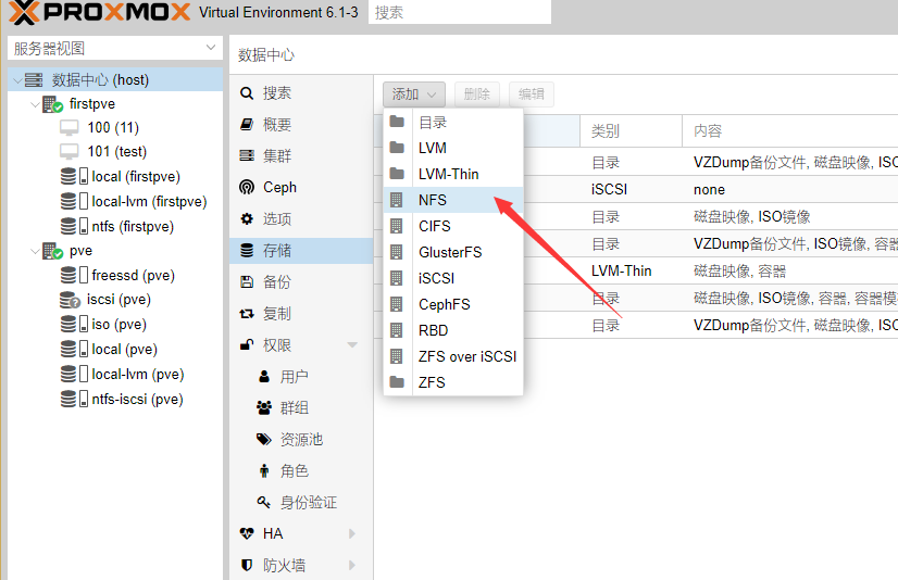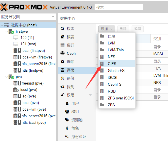 进入文件和储存服务,找到共享,然后添加匿名的共享,因为pve面板上没有用户验证,只能通过匿名访问