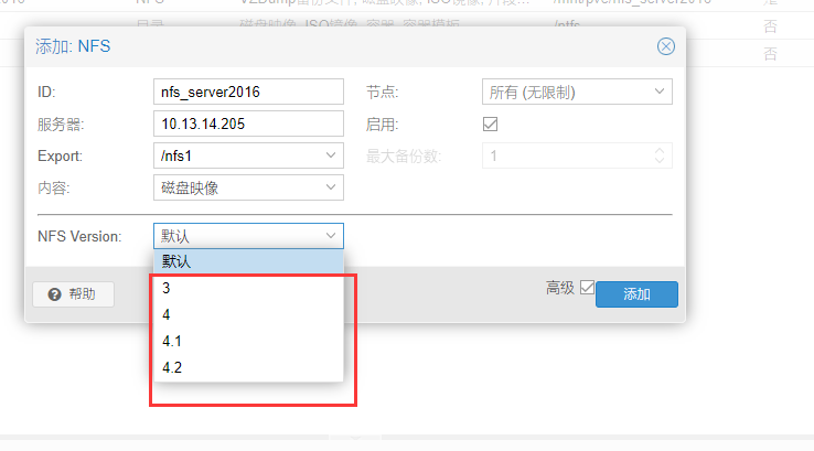 依旧像ISCSI那样,直接输入ID(自定义),服务器IP,export会自动识别出来。内容就需要根据自己的意思选中咯。还有勾选高级选项,会出现nfs版本,这里要对应server,server2016默认是4.1,所以我选择了4.1