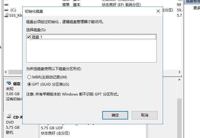 已经成功装载,只是没分区信息,现在去磁盘管理 ,进行初始化,分区。