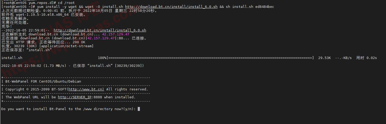 5、进入/root文件夹下,执行安装宝塔命令,可以正常运行了:
