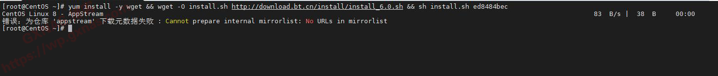 本来想着在Centos8里面安装宝塔环境,登录Centos8的SSH以后,用root运行宝塔官方一键安装脚本,结果报错了,提示:为仓库 'appstream' 下载元数据失败 : Cannot prepare internal mirrorlist;