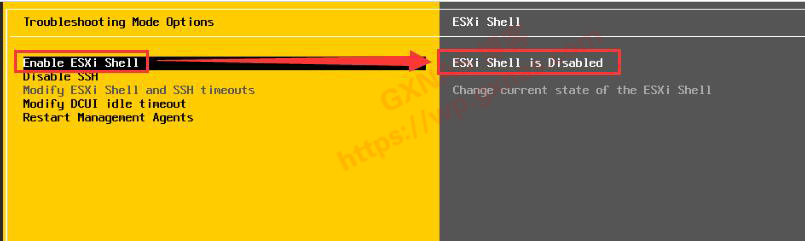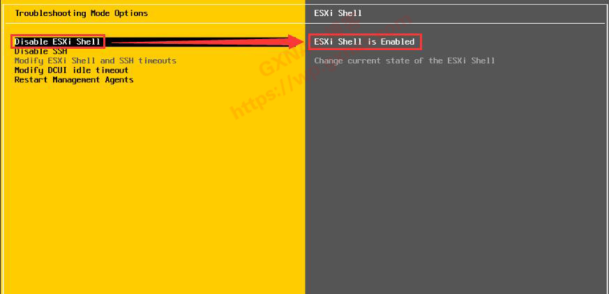 先看一下“Enalbe ESXi Shell”这里,如果你没改过,这个地方默认是写“ESXi Shell is Disabled”,按一次回车;(如果你之前有过改动,已经显示“ESXi Shell is Enabled”的,此步骤跳过。)