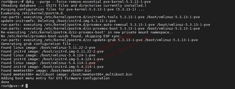 #查看当前用的内核uname -a#查看系统有多少个内核dpkg --get-selections |grep kernel#卸载无用内核,命令后面的pve-kernel-5.3.13-1-pve,是根据上一条命令显示出来的内核,需要修改成你自己PVE显示不用的,后面显示有purge字样的为系统使用中,不可以卸载的,其他的均可以卸载)dpkg --purge --force-remove-essential pve-kernel-5.3.13-1-pvedpkg --purge --force-remove-essential pve-kernel-5.3.13-3-pvedpkg --purge --force-remove-essential pve-kernel-5.3.18-1-pvedpkg --purge --force-remove-essential pve-kernel-5.3.18-2-pvedpkg --purge --force-remove-essential pve-kernel-5.3.18-3-pvedpkg --purge --force-remove-essential pve-kernel-5.4 dpkg --purge --force-remove-essential pve-kernel-5.4.101-1-pvedpkg --purge --force-remove-essential pve-kernel-5.4.103-1-pvedpkg --purge --force-remove-essential pve-kernel-5.4.106-1-pvedpkg --purge --force-remove-essential pve-kernel-5.4.114-1-pvedpkg --purge --force-remove-essential pve-kernel-5.4.119-1-pvedpkg --purge --force-remove-essential pve-kernel-5.4.124-1-pvedpkg --purge --force-remove-essential pve-kernel-5.4.34-1-pvedpkg --purge --force-remove-essential pve-kernel-5.4.41-1-pvedpkg --purge --force-remove-essential pve-kernel-5.4.44-1-pvedpkg --purge --force-remove-essential pve-kernel-5.4.44-2-pvedpkg --purge --force-remove-essential pve-kernel-5.4.55-1-pvedpkg --purge --force-remove-essential pve-kernel-5.4.60-1-pvedpkg --purge --force-remove-essential pve-kernel-5.4.65-1-pvedpkg --purge --force-remove-essential pve-kernel-5.4.73-1-pvedpkg --purge --force-remove-essential pve-kernel-5.4.78-1-pvedpkg --purge --force-remove-essential pve-kernel-5.4.78-2-pvedpkg --purge --force-remove-essential pve-kernel-5.4.98-1-pve#把不用的内核删除完成后,更新引导菜单update-grub#重启PVEreboot
