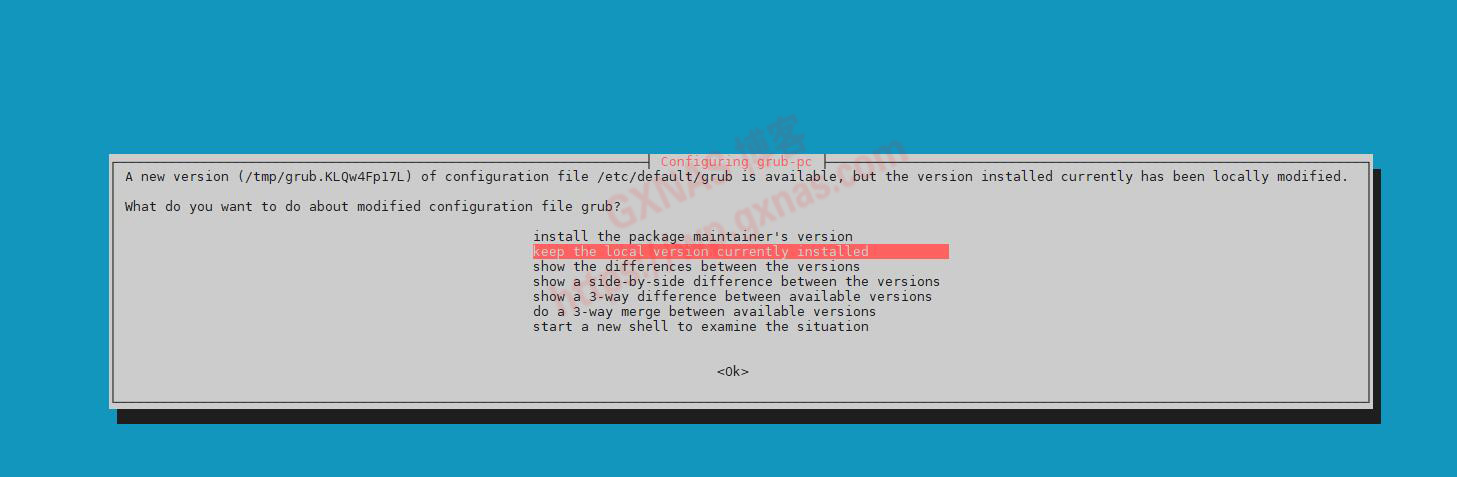 3、输入以下命令更新系统(由于PVE的源在国外服务器,建议全局开飞机,否则更新非常的慢),期间有可能弹出类似下图的提示需要选择的界面,直接无脑的按回车就行: