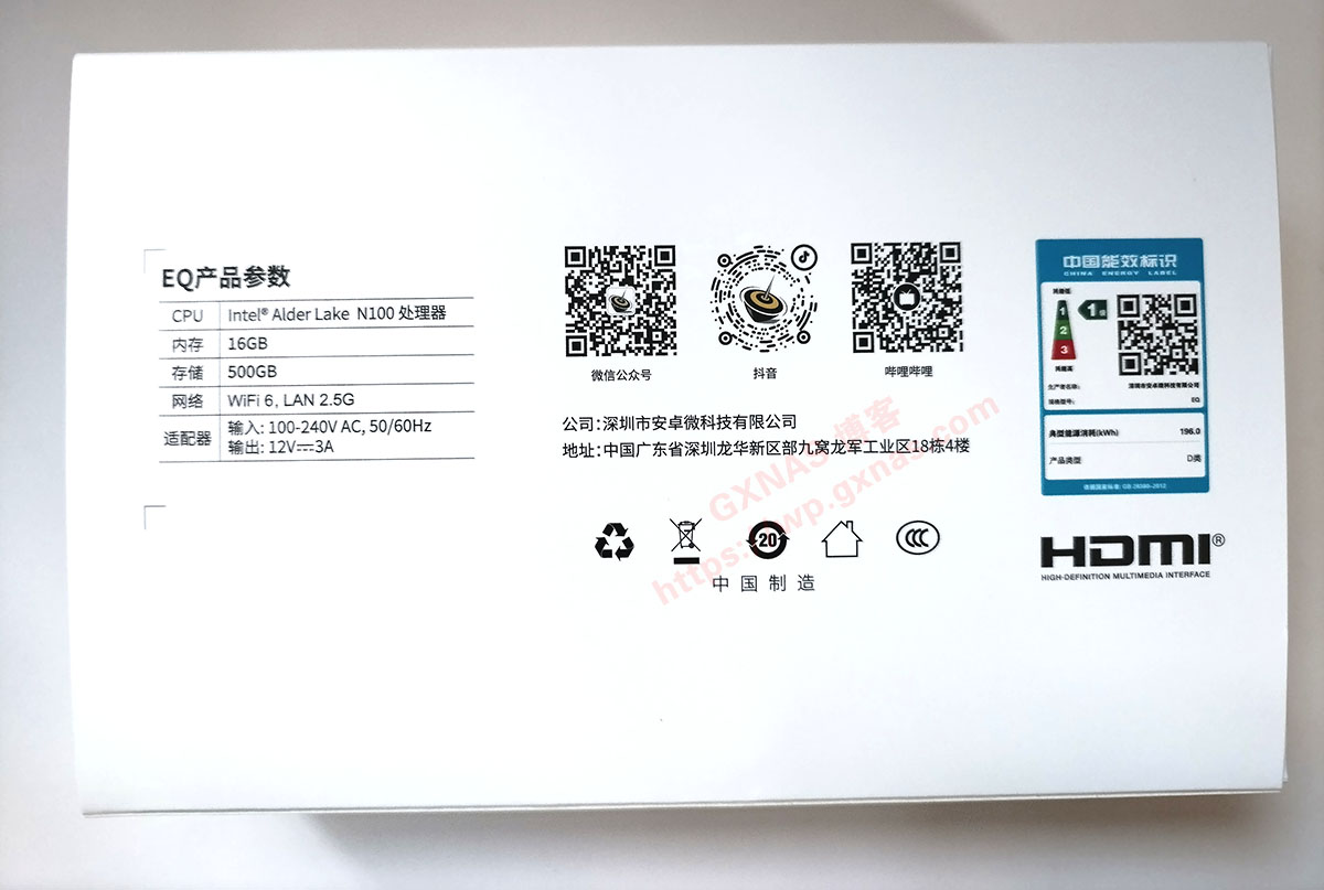 3、再来个背面照,上面写有CPU型号为N100,内存16GB,硬盘为500GB,以及一级能效的标识,说明这台机器非常省电。