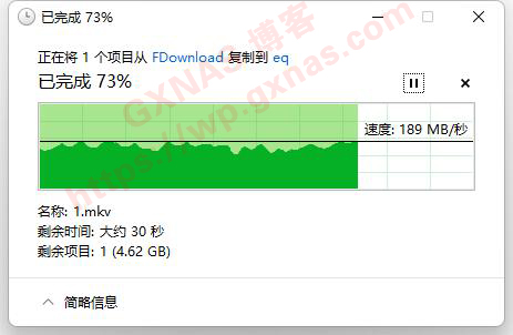 1、下图为从我的破电脑复制文件到小主机的速度,初始速率193MB/s;