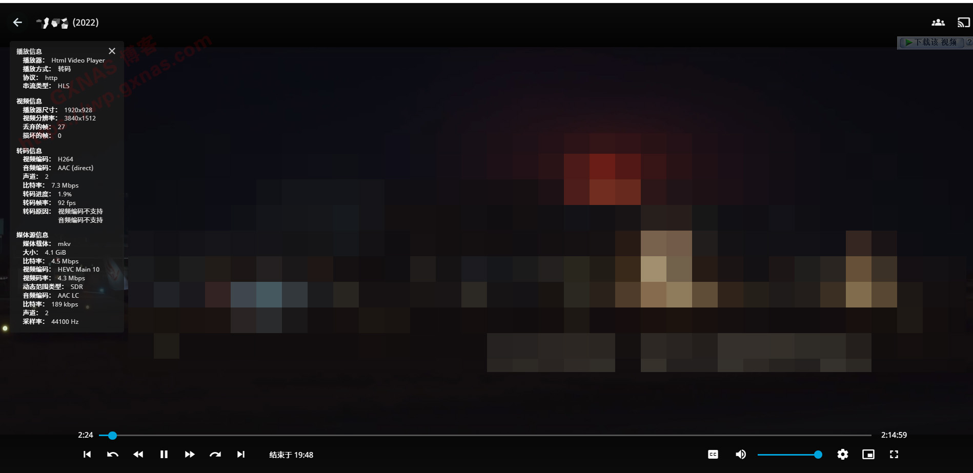 3、下图是使用Jellyfin开启硬解4K  HEVC视频转码的效果(为了避免影片版权纠纷,以下视频图像做了PS模糊处理,并非播放时出现马赛克);