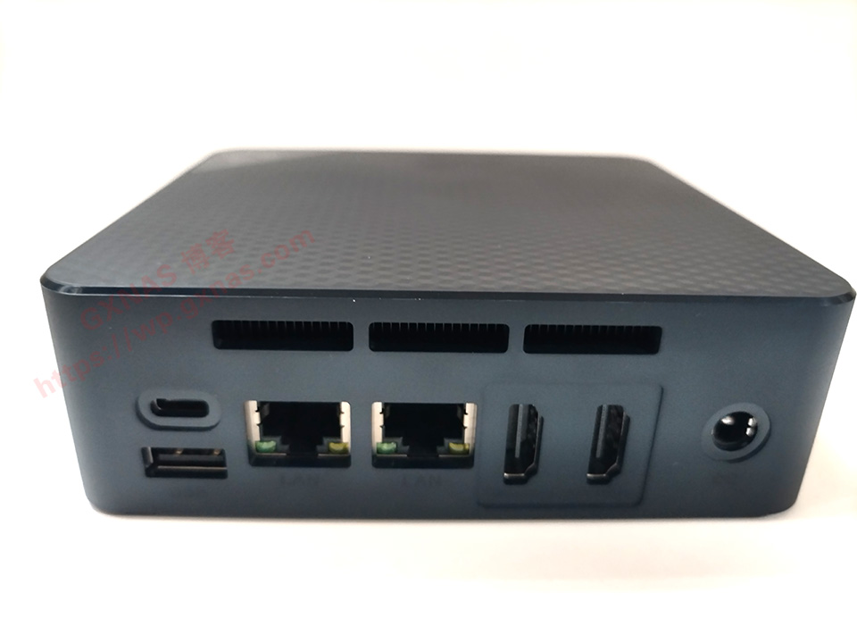 7、主机背面的接口就丰富了,上面有一排散热孔,可以为内存、硬盘、网卡进行散热,避免了高速复制文件发热量过大导致网卡降速的风险;下方还有一个Type-C接口,一个USB3.2 Gen2接口、两个2.5GB网口、两个HDMI2.0高清接口,以及一个DC电源口,可以同时支持两个显示画面输出;