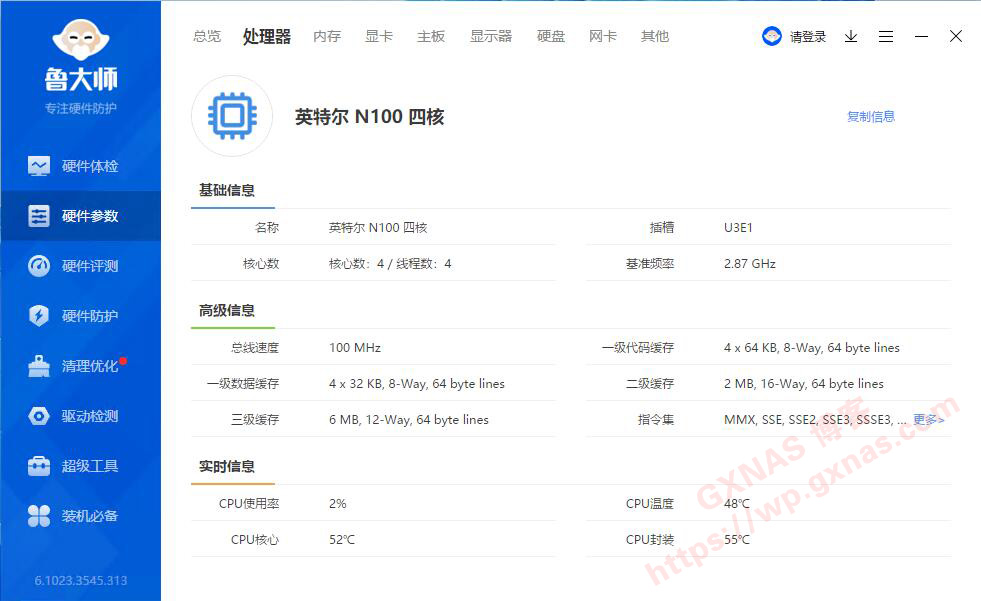 2、CPU是12代最新的型号N100,四核心四线程,三级缓存6MB,目前运行频率为2.87GHz为基准频率,没有开启睿频;
